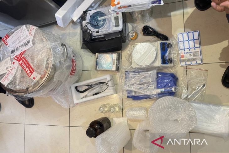 Barang bukti pengungkapan praktik clandestine lab narkotika jenis etomidate yang beroperasi di kawasan Apartemen Greenbay, Pluit, Jakarta Utara, Jumat (9/1/2026). ANTARA/HO-Ditresnarkoba Polda Metro JayaDalam pengungkapan kasus ini juga ditemukan fakta bahwa alat produksi lab ilegal ini dikirim dari India, sementara HW, WNA Tiongkok berperan sebagai peracik utama dalam proses pembuatan cairan etomidate.